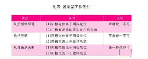 由于晶閘管只有導(dǎo)通和關(guān)斷兩種工作狀態(tài),所以它具有開關(guān)特性,這種特性需要一定的條件才能轉(zhuǎn)化,此條件如附表所示。