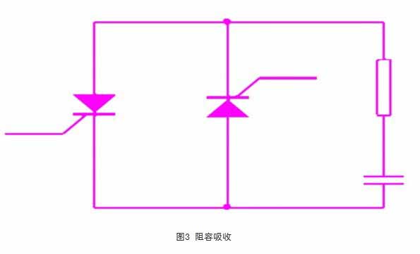 在晶閘管兩端并聯(lián)r-c阻容吸收回路,如圖3所示,利用電容吸收過壓。其實(shí)質(zhì)就是將造成過電壓的能量變成電場(chǎng)能量?jī)?chǔ)存到電容中,然后釋放到電阻中消耗掉。
