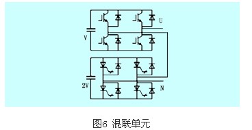 為了輸出更多的電平,減少隔離電源數(shù)量,每個(gè)單元電路結(jié)構(gòu)可以不完全相同,串聯(lián)單元本身還可以是一個(gè)多電平逆變器,如二極管箝位型逆變器,或飛跨電容箝位型逆變器。這種由不同結(jié)構(gòu)單元串聯(lián)而成的逆變器稱為混聯(lián)型逆變器,如圖5(b)所示。如果需要三相,則可以用三組這樣的混聯(lián)單元按照?qǐng)D5(a)所示連接方法相連。實(shí)際中,由于級(jí)聯(lián)多電平主要用于高壓大功率,為了充分發(fā)揮不同類型器件的優(yōu)點(diǎn)(高壓和高頻),同一組(相)相串聯(lián)的不同的逆變單元中常常使用不同的器件,這種連接方式也稱為混聯(lián),如圖6所示,igbt和igct的混聯(lián)型逆變單元,igbt工作于相對(duì)較高的頻率,較低的電壓;而igct工作于相對(duì)較高的電壓,較低的頻率。