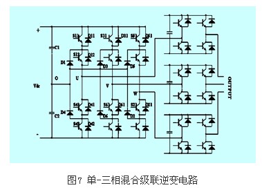 除了上述的聯(lián)結(jié)方式以外,還有由一個(gè)三相三電平二極管箝位逆變器或飛跨電容型逆變器和三個(gè)單相h橋逆變器串聯(lián)形成的三相級(jí)聯(lián)逆變器。這種電路結(jié)構(gòu)簡(jiǎn)單,控制也易于實(shí)現(xiàn),實(shí)際中已有使用。圖7為單-三相混合級(jí)聯(lián)逆變電路圖。