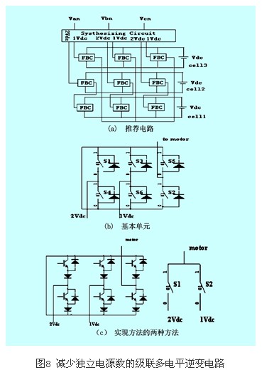 圖8(a)為推薦的三相級(jí)聯(lián)逆變主電路,它只有三個(gè)獨(dú)立直流電源,每相根據(jù)各開(kāi)關(guān)的不同組合可以產(chǎn)生+2vdc、-2vdc、+vdc或-vdc電平的電壓。圖中fbc為基本的h橋逆變單元。為了避免各直流電源短路,增加了一組合成電路(synthesizingcircuit)。合成電路基本模式如圖8(b)所示,具體實(shí)現(xiàn)由圖8(c)所示的兩種方法完成,s1和s2為雙向開(kāi)關(guān)。