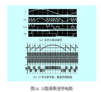 本方法主要針對(duì)非對(duì)稱混聯(lián)逆變電路。為了實(shí)現(xiàn)輸出電壓波形的連續(xù)調(diào)幅,需要對(duì)多電平電路進(jìn)行pwm控制。同時(shí)為了降低脈沖階躍幅度帶來(lái)的電磁干擾,連續(xù)調(diào)幅時(shí)產(chǎn)生的脈沖不超過(guò)1v。圖14為23型3級(jí)h橋非對(duì)稱混聯(lián)逆變電路(三個(gè)級(jí)聯(lián)單元的直流電壓比為1:2:4)的混合pwm調(diào)制方法示意圖。首先對(duì)電壓為2v和4v單元按圖14(a)中的iii、iv波形進(jìn)行驅(qū)動(dòng),然后將i中正弦調(diào)制波和iii、iv波形相減,得到1v單元的調(diào)制波ii。再用ii和三角載波進(jìn)行調(diào)制,形成1v單元的pwm驅(qū)動(dòng)波形,如圖14(b)所示。顯然,該法只對(duì)1v單元進(jìn)行了pwm調(diào)制,因此在選擇器件時(shí),就可以在2v和4v單元使用低頻大功率器件,如igct;而在1v的pwm單元采用高頻小功率器件。