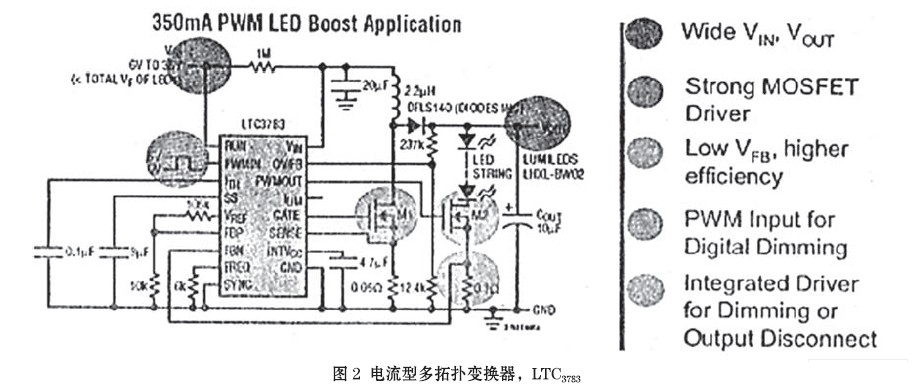 LTC3783是帶恒流PWM調(diào)光的電流型多拓?fù)渥儞Q器(圖2),用于驅(qū)動(dòng)大功率LED燈串。本項(xiàng)專利技術(shù)可提供非常快而準(zhǔn)確的負(fù)載切換,不會(huì)產(chǎn)生瞬時(shí)的欠電壓或過(guò)電壓,能數(shù)字式達(dá)到3000∶1的調(diào)光率(100Hz),純色的PWM調(diào)光可確保白色LED和紅綠藍(lán)(RGB) LED的顏色完整性。LTC3783利用模擬控制,容許附加100∶1的調(diào)光比,因人眼對(duì)周圍光線的變化很敏感,故這一比率必不可少。該多功能的控制器可用于升壓、降壓、升降壓雙向變換器或反激式(Flyback)變換器,或作為恒流/恒壓的調(diào)節(jié)器。利用MOSFET的通態(tài)電阻(on-resistance)可取消傳感電流的電阻器,并提高了效率。LTC3783芯片的應(yīng)用還包括:高電壓LED陣列和LED背光,以及在電訊、自動(dòng)化與工業(yè)控制系統(tǒng)中的調(diào)節(jié)器。