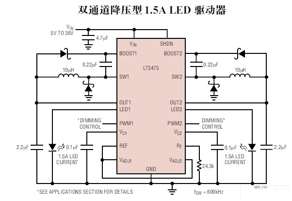LTC3475以其寬的輸入電壓范圍(4V~36V,max40V),可調(diào)節(jié)含汽車動(dòng)力系統(tǒng)在內(nèi)的廣闊的電源陣列。它的開關(guān)頻率調(diào)節(jié)幅度為200kHz~2MHz,能利用很小的電感器和陶瓷電容器,與耐熱的TSSOP-16組件結(jié)合,在驅(qū)動(dòng)2個(gè)或4個(gè)大電流LED時(shí),可提供結(jié)構(gòu)非常緊湊的解決方案。