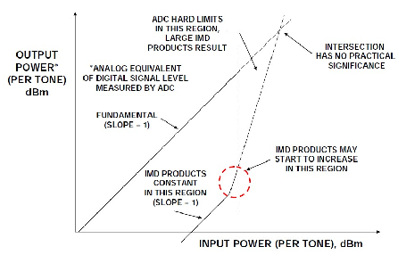 類(lèi)似地,信號(hào)每增加1 dB,三階IMD (IMD3)幅度就增加3 dB,如圖中slope = 3 曲線(xiàn)所示。