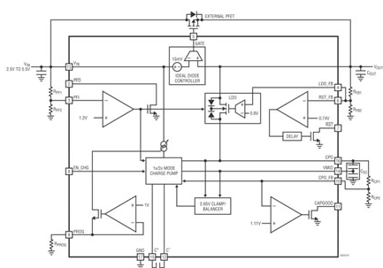 任何可高效地滿足上述小到中電流超級(jí)電容器充電器 IC 設(shè)計(jì)限制的解決方案都會(huì)包括一個(gè)面向兩節(jié)串聯(lián)超級(jí)電容器和基于充電泵的充電器以及自動(dòng)容量平衡和電壓箝位。凌力爾特已經(jīng)為這類應(yīng)用開發(fā)出了一個(gè)簡(jiǎn)單但尖端的單片超級(jí)電容器充電器 IC,該 IC 不需要電感器,也不需要平衡電阻器,提供了反向隔離,并有多種工作模式,而且靜態(tài)電流還很低。
