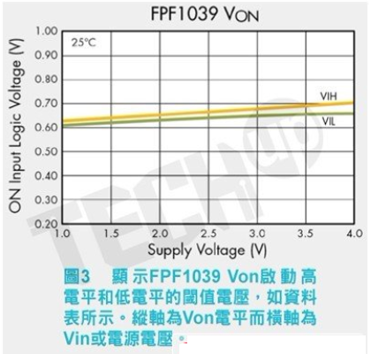 資料表中的規(guī)格增加了針對(duì)製程、電壓和溫度變化的緩衝,表明Von必須超過1.0V來開啟開關(guān),并且必須低于0.4V來關(guān)閉開關(guān)。這帶來了非常簡單的驅(qū)動(dòng)電路,可以直接連接至微處理器。此Von規(guī)格隨元件而不同且可能不一定會(huì)如圖3那樣平坦。不要停留在資料表中顯示靜態(tài)閾值電平的那一行;可以參照曲線來瞭解全部詳情。