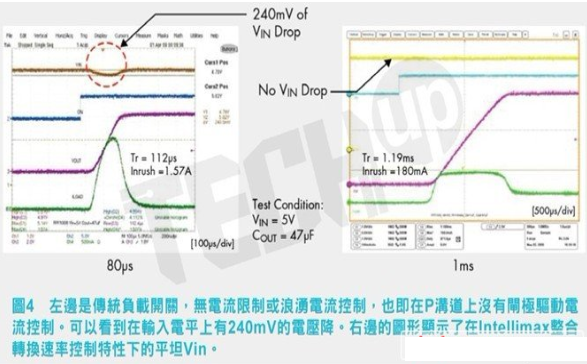 我們應(yīng)該更進(jìn)一步鉆研的下一代智慧型FET的特性是當(dāng)開關(guān)關(guān)閉時(shí)會(huì)發(fā)生什么?採用離散P溝道的傳統(tǒng)負(fù)載開關(guān)可以完全關(guān)閉并連接輸入至輸出,不管是重負(fù)載還是大電容載入在輸出腳上。如果這種情況發(fā)生,通常初級(jí)端輸入電平會(huì)顯示電壓突降,它可能影響與偏置電平相關(guān)聯(lián)的精密類比數(shù)位轉(zhuǎn)換器(ADC)或感測(cè)器。在過去,電阻/電容(R/C)網(wǎng)路添加至閘極以降低開啟速度,但這會(huì)增加專案的設(shè)計(jì)時(shí)間和規(guī)模。Intellimax支援轉(zhuǎn)換速率控制特性,藉著在輸入端限制浪涌電流,可使電平中斷最小化。圖4顯示了此方案在實(shí)證研究的實(shí)驗(yàn)室測(cè)試中的一個(gè)例證。注意,左邊為採用傳統(tǒng)P溝道方法對(duì)Vin電平的影響,右邊的則是Intellimax器件的影響。