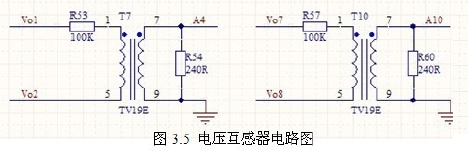 此系統(tǒng)輸出是三相交流電,輸出線電壓為380V,故選擇TV19E 電壓互感器,其輸出負載電阻可以接0~500 歐,輸出交流電壓0~2.5V,此系統(tǒng)采用240 歐的電阻,輸出電壓-1.2V~1.2V。滿足DSP 的輸入要求。電路如圖3.5 所示。