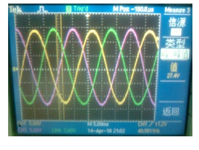 光伏并網(wǎng)發(fā)電系統(tǒng)要實現(xiàn)并網(wǎng),必須使逆變輸出與電網(wǎng)電壓的幅度、相位與頻率達到一致,否則將會使電網(wǎng)諧波增加、電能質(zhì)量下降,并產(chǎn)生并網(wǎng)環(huán)流,甚至造成光 伏發(fā)電系統(tǒng)的損壞。因此在并網(wǎng)過程中必須進行同步鎖相控制、輸出電壓幅度控制以滿足并網(wǎng)的要求。根據(jù)IEEE Std 1547-2003 規(guī)定最大相位誤差為20 度,瞬時電壓誤差不能超過電網(wǎng)電壓的10%、最大頻率誤差不能超過0.3Hz。圖片4-1為獨立工作模式時純電阻負載兩端的電壓波形。