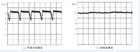 圖6 中所標(biāo)的電壓值為乘以分壓器變比以后的值。圖6(a) 為沒(méi)有經(jīng)過(guò)并聯(lián)的兩路分別輸出時(shí)的電壓波形,可以看到,單路電壓輸出存在缺口,而且缺口處脈動(dòng)較大,并有一定的毛刺。圖中6(b)為兩路并聯(lián)后輸出的電壓波形(未經(jīng)電容濾波),與圖6(a)相比較,可以清楚地看到兩路并聯(lián)后,大的缺口在輸出波形中消失,輸出電壓脈動(dòng)明顯減小,紋波變低,達(dá)到了實(shí)驗(yàn)?zāi)康?,?yàn)證了設(shè)計(jì)思想的正確性。