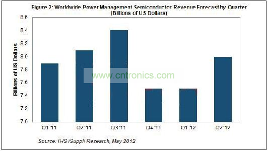據(jù)IHS iSuppli公司的電源管理市場(chǎng)追蹤報(bào)告,繼2011年第四季度慘跌之后,電源管理半導(dǎo)體在2012年初有所回升,并在第二季度終于走上明顯增長(zhǎng)之路,主要是受消費(fèi)與工業(yè)領(lǐng)域的擴(kuò)張推動(dòng)。