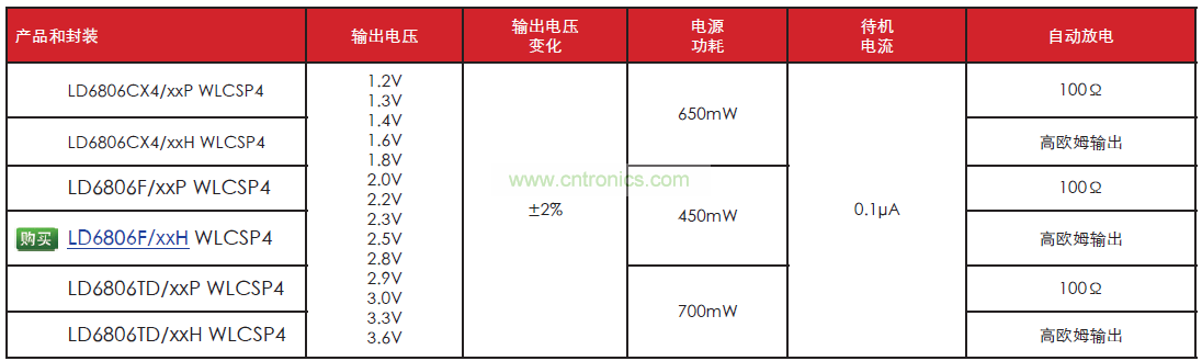 除了 0.76 毫米 x 0.76 毫米的 WLCSP4 封裝選項之外,LD6806 系列還可采用 1.0毫米 x 1.45 毫米 XSON6 以及 1.5 毫米 x2.9 毫米 SOT753 封裝。兩個變型均以各個封裝樣式提供,使設(shè)計人員能夠選擇適用于非放電應用的高歐姆輸出,或選擇自動放電變型,它配備有在設(shè)備處于禁用狀態(tài)時提供低歐姆輸出的下拉式開關(guān)晶體管。
