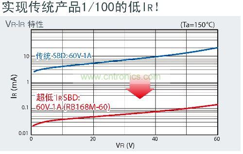 此次,羅姆通過采用最適合高溫環(huán)境的金屬,實現(xiàn)了業(yè)界頂級低IR化。與傳統(tǒng)的SBD相比,IR降低到約1/100,使高溫環(huán)境下的使用成為可能。
