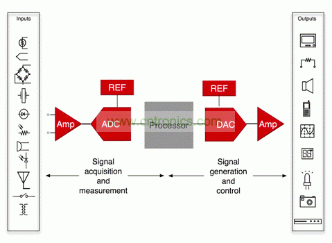 圖 1 所示結(jié)構(gòu)圖可代表信號處理的所有系統(tǒng)。如果它是一個測量或者數(shù)據(jù)采集系統(tǒng),則信號鏈開始于傳感器,經(jīng)過信號調(diào)節(jié)電路,進入一個 ADCr,然后結(jié)束于處理器。如果它是一個控制系統(tǒng)、一個音頻處理系統(tǒng)亦或是一個軟件定義無線電設(shè)備則可能存在一些必須變回到模擬信號的處理器輸出;這種情況顯示在結(jié)構(gòu)圖的右手側(cè)二分之一處。