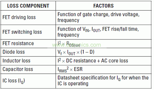 DC/DC轉(zhuǎn)換器的效率,是進(jìn)行電源設(shè)計時需要考慮的最重要屬性之一。低效率會轉(zhuǎn)換成高功耗,必須要在印刷電路板(PCB)上使用單獨的散熱器或者更多的銅,才能處理這些功耗。功耗也對電源上游器件提出了更高的要求。如表3所示,功耗共有幾個組成部分。