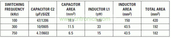 表4列出了三種設(shè)計要求的總電路板面積,以及電容和電感的焊盤面積。電容或者電感的建議焊盤面積,稍稍大于單個組件本身,且三種設(shè)計舉例均使用了該面積。每個組件占用的面積相加(其包括IC、濾波器以及所有其它小型電阻器和電容的焊盤尺寸),然后將得到的結(jié)果乘以2倍(考慮到組件的間距),便得到總面積。100-kHz和750-kHz設(shè)計之間存在近250 mm2的總面積節(jié)省,從而使濾波器體積縮小50%,而板空間占用減少55%。但是,存在收益遞減規(guī)律,因為電容和電感值無法減少至零!換句話說,不斷推高頻率并不能夠一直減小總尺寸,因為你無法總是能夠在市場上買到這些尺寸適合且批量生產(chǎn)的電感和電容。注意,33-µH和15-µH電感占用相同的面積。存在這種可能性,是因為33-µH電感的高度為3.5 mm,而15-µH電感僅高2.4 mm。我們想通過這兩種電感來說明的觀點是:電感與體積成正比例關(guān)系。