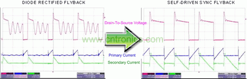 在自驅(qū)動(dòng)同步反向電源中,輸出二極管被一個(gè) N 通道 MOSFET 代替,同時(shí)必須向電源變壓器添加一個(gè)繞組以生成同步柵極驅(qū)動(dòng)信號(hào)。相比輸出二極管整流器,該同步MOSFET的低導(dǎo)通電阻可帶來更低的傳導(dǎo)損耗,這就極大地提高了高負(fù)載電流時(shí)的效率。