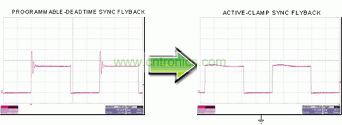 圖 4 描述了如何進(jìn)一步提高效率并利用同步 MOSFET 柵極驅(qū)動(dòng)信號(hào)來控制一個(gè)有源主緩沖器。這種結(jié)構(gòu)通常被稱為有源鉗位反向結(jié)構(gòu)。在前面示意圖中,我們已經(jīng)使用 RCD 緩沖器來降低一次側(cè) MOSFET 漏-源-電壓的電壓峰值。該電壓峰值出現(xiàn)在一次側(cè) MOSFET 關(guān)閉時(shí),這主要是由于變壓器主繞組的泄露能量造成的。RCD 緩沖器消耗了其緩沖器電阻中的這種能量。在有源鉗位反向結(jié)構(gòu)中,泄露能量由鉗位電容捕獲,并被帶至負(fù)載再循環(huán),最后返回到輸入。這就構(gòu)成了一個(gè)實(shí)際上無(wú)損耗的緩沖器。RCD 緩沖器的漏-源極-電壓波形和一個(gè)有源鉗位的對(duì)比關(guān)系如圖 5 所示。該有源鉗位消除了高頻峰值。除消除漏能損耗以外,開關(guān)損耗和 EMI 也得到了極大降低。在許多情況下,這種有源鉗位緩沖器允許使用低漏-源-電壓額定值的一次側(cè) MOSFET,從而進(jìn)一步降低了損耗,并有可能降低 MOSFET 的成本。