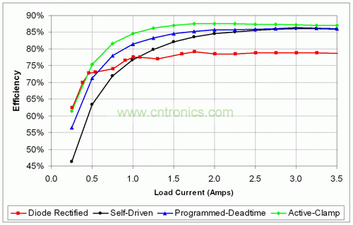 圖 8 顯示了有源鉗位電路中兩種不同的延遲設(shè)置,以及它們是如何影響不同負(fù)載條件下的效率的。由較大 Rdel 電阻值編程獲得的較長(zhǎng)延遲時(shí)間降低了輕負(fù)載直通損耗,從而極大地提高了輕負(fù)載效率。但是,這種長(zhǎng)延遲時(shí)間同時(shí)也增加了同步 MOSFET 主體二極管的傳導(dǎo)時(shí)間,使?jié)M負(fù)載條件時(shí)的效率降低了 1% 左右。使用較低值 Rdel 后,滿負(fù)載同步 MOSFET 主體二極管傳導(dǎo)損耗在直通損耗中占主導(dǎo)地位。在某些情況下,人們也許必須經(jīng)由選取合適的 Rdel 值來選擇是使輕負(fù)載效率最大化,還是讓最大負(fù)載效率最大化。圖 9 所示的有源鉗位反向電源運(yùn)用了所有這些效率提升方法。這種結(jié)構(gòu)使最大負(fù)載的效率提高大約 10%,并且擁有和原始二極管整流設(shè)計(jì)差不多一樣的輕負(fù)載效率性能。[page]