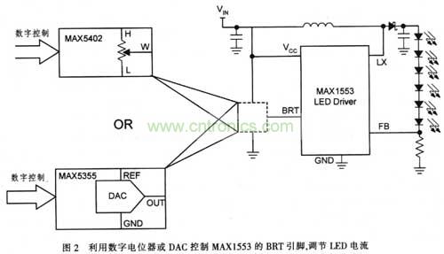 但在當前的許多應(yīng)用中,DAC與數(shù)字電位器之間選擇的界限比較模糊,圖2中的DAC和數(shù)字電位器都可用于控制MAXl553 LED驅(qū)動器。MAXll53亮度(BRT)輸入的直流電壓和檢流電阻決定了LED的電流。
