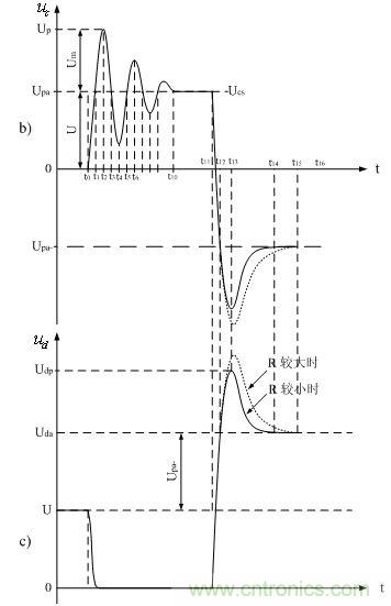 到t4時(shí)刻之后,輸入電壓ui對(duì)分布電感Ls和分布電容Cs進(jìn)行充電的過(guò)程,以及分布電感Ls和分布電容Cs互相進(jìn)行充電的過(guò)程,與t0~t4時(shí)刻基本相同。但由于在此期間,輸入電壓的上升率等于0,輸入電壓不再向分布電感Ls和分布電容Cs提供能量,因此,分布電感Ls與分布電容Cs產(chǎn)生自由振蕩的幅度是隨著時(shí)間衰減的,其衰減速率與等效電阻大小有關(guān)。