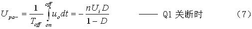 在圖6-b中,Upa為變壓器初級(jí)線(xiàn)圈正激輸出電壓的半波平均值,此值與輸入電壓相等;Upa-為變壓器初級(jí)線(xiàn)圈反激輸出電壓的半波平均值,此值與占空比相關(guān);當(dāng)占空比等于0.5時(shí),Upa-與輸入電壓在數(shù)值上相等,但符號(hào)相反。