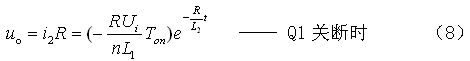 (8)式中,L1、L2分別為開(kāi)關(guān)變壓器初、次級(jí)線(xiàn)圈的電感,n為開(kāi)關(guān)變壓器線(xiàn)圈的匝數(shù)比,n=N2/N1,Ui為變壓器初級(jí)線(xiàn)圈的輸入電壓,Ton為開(kāi)關(guān)管的導(dǎo)通時(shí)間,R為等效負(fù)載電阻。