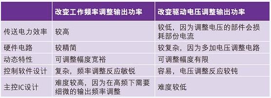 在諧振系統(tǒng)中調(diào)整功率的方式另外還有改變線圈上的電感值或電容值的方法,但在實際量產(chǎn)上并不容易完成所以不被采用。在圖(五)是無線充電聯(lián)盟規(guī)格書中所提的兩種控制發(fā)射線圈輸出功率的方法,第一種是變頻調(diào)整式,另一種則是變壓調(diào)整式。