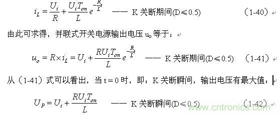 當并聯(lián)式開關(guān)電源工作于電流臨界連續(xù)狀態(tài)時,流過儲能電感的初始電流i(0)等于0(參看圖1-13),即:(1-49)式中流過儲能電感電流的最小值iLX等于0。因此,由(1-45)和(1-49)式,可求得并聯(lián)式開關(guān)電源輸出電壓Uo為: