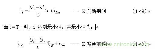 式中i(Ton+) 為控制開關(guān)K從Ton轉(zhuǎn)換到Toff的瞬間之前流過電感的電流,i(Ton+)也可以寫為i(Toff-),即:控制開關(guān)K關(guān)斷或接通瞬間,之前和之后流過電感L的電流相等。實際上(1-47)式中的i(Ton+) 就是(1-45)式中的iLm,因此,(1-47)式可以改寫為: