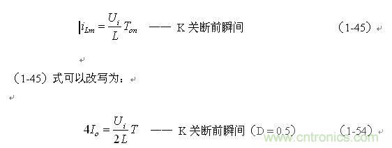 (1-44)式中iL為流過儲能電感L的電流(瞬時值),t為時間變量;i(0)為的初始電流,即:控制開關(guān)K接通前的瞬間流過儲能電感L中的電流。當開關(guān)電源工作于電流臨界連續(xù)狀態(tài),或不連續(xù)電流狀態(tài)時(即D≤0.5),i(0) = 0 ,由此可以求得流過儲能電感L的最大電流為: