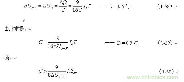 同理,(1-59)和(1-60)式的計算結(jié)果,只給出了計算并聯(lián)式開關(guān)電源儲能濾波電容C的中間值,或平均值,對于極端情況可以在平均值的計算結(jié)果上再乘以一個大于1的系數(shù)。