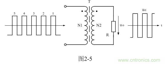 為了簡(jiǎn)單起見(jiàn),我們把雙激式變壓器開(kāi)關(guān)電源等效成如圖2-5所示電路。圖2-5與圖2-1所示電路的不同之處在于,圖2-1輸入電壓是直流脈沖方波,而圖2-5輸入電壓是交流脈沖電壓方波。因此,圖2-5所示電路與一般的變壓器電路在工作原理上沒(méi)有根本的區(qū)別。