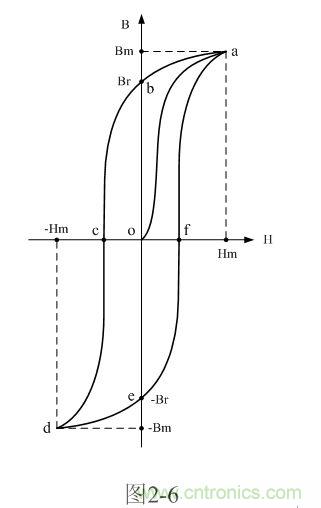 圖2-6是雙激式開(kāi)關(guān)變壓器鐵芯磁感應(yīng)強(qiáng)度B與磁場(chǎng)強(qiáng)度H之間的關(guān)系曲線圖,或稱變壓器鐵芯磁化曲線圖或磁滯回線圖。之所以把圖2-6磁滯回線圖,是因?yàn)榇鸥袘?yīng)強(qiáng)度B比磁場(chǎng)強(qiáng)度H滯后一個(gè)相位或者一段時(shí)間。