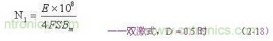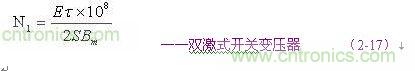 (2-17)和(2-18)式,為計(jì)算雙激式開關(guān)變壓器初級線圈N1繞組匝數(shù)的公式。式中,N1為變壓器初級線圈N1繞組的最少匝數(shù),S為變壓器鐵芯的導(dǎo)磁面積(單位:平方厘米),Bm為變壓器鐵芯的最大磁感應(yīng)強(qiáng)度(單位:高斯),τ為脈沖寬度,或電源開關(guān)管的導(dǎo)通時(shí)間(單位:秒),E為脈沖電壓的幅度,單位為伏,F(xiàn)為開關(guān)電源的工作頻率,單位赫芝。