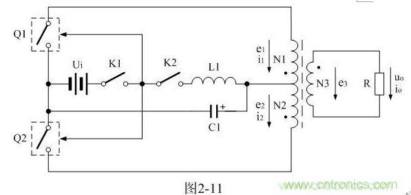 在圖2-11中,開機(jī)時(shí),驅(qū)動電路電源開關(guān)K1首先接通,電源Ui首先給電源開關(guān)管Q1、Q2的驅(qū)動電路加電;然后開關(guān)管電源開關(guān)K2接通,由于L1的作用,C1兩端的電壓只能緩慢上升,以保證加到變壓器初級線圈的電壓不會突然升高,使流過變壓器初級線圈的電流過大,導(dǎo)致變壓器鐵芯出現(xiàn)飽和;關(guān)機(jī)時(shí),開關(guān)管電源開關(guān)K2首先關(guān)斷,而后驅(qū)動電路電源開關(guān)K1再關(guān)斷,由于C1兩端的電壓緩慢下降,使變壓器鐵芯可進(jìn)行充分退磁,以保證下次開機(jī)的時(shí)候,變壓器鐵芯磁滯回線的初始相位總是從0開始。