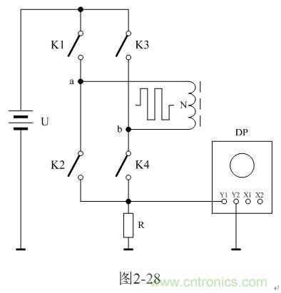 圖2-28中,U是電源電壓,N為變壓器初級(jí)線(xiàn)圈,控制開(kāi)關(guān)K1、K2、K3、K4組成橋式開(kāi)關(guān)控制電路,K1和K4為一組,K2和K3為一組,兩組開(kāi)關(guān)輪流接通與斷開(kāi),把電源電壓正反向加于變壓器初級(jí)線(xiàn)圈兩端;R為取樣電阻,通過(guò)測(cè)量R兩端的電壓,就可以知道流過(guò)變壓器初級(jí)線(xiàn)圈的電流;取樣電壓被送到示波器DP進(jìn)行顯示。