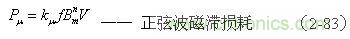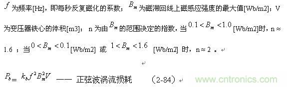 當(dāng)加到變壓器初級(jí)線(xiàn)圈兩端的電壓為正弦波時(shí),變壓器鐵芯的磁滯損耗和渦流損耗可分別用下面的(2-83)和(2-84)經(jīng)驗(yàn)公式進(jìn)行估算: