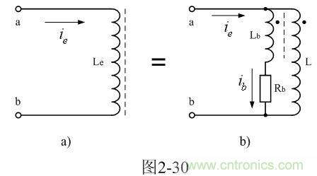 圖2-30-a中,Le是一個同時考慮渦流損耗因素的電感;L是變壓器原初級線圈的電感;Rb是鐵芯渦流損耗電阻;Lb是一個互感線圈,通過它把流過電阻Rb的電流感應(yīng)到變壓器初級線圈中;當(dāng)流過電阻Rb的電流增加時,流過通過Lb互感線圈的感應(yīng)作用,使流過變壓器初級線圈L的電流也同時增加。