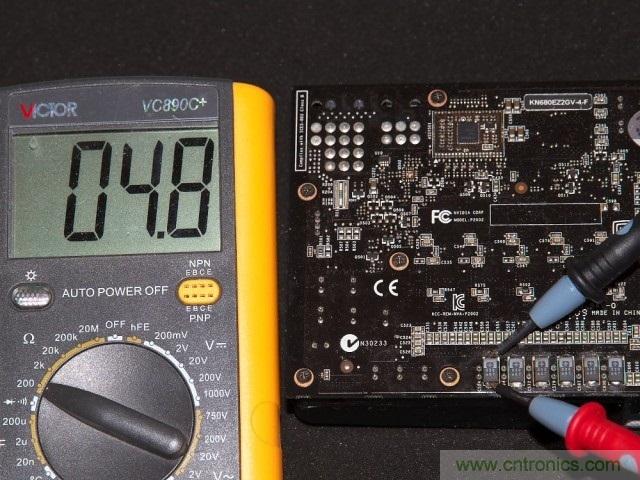 焊接完成后一是要用放大鏡配合電路圖仔細(xì)的測量各個元器件之間的連接關(guān)系,確定有無短路和虛焊。另外一個簡單的辦法就是通過直接測量供電回路的電阻值(關(guān)機(jī)狀態(tài)下)來確定是否有明顯的焊接失誤。通常來說GPU核心供電回路的電阻值在1歐姆到10幾歐姆之間,而顯存供電回路則是100-140歐姆左右。至于測量點(diǎn),選擇核心和顯存供電模塊輸出電容的兩個引腳就可以了。可以看到改造前后核心、顯存供電回路的電阻值都在4.8歐/125歐左右,因此焊接是沒有問題的。