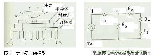 散熱器是開關(guān)電源的重要部件,它的散熱效率高與低關(guān)系到開關(guān)電源的工作性能,散熱器通常采用銅或鋁,雖然銅的熱導(dǎo)率比鋁高2倍但其價(jià)格比鋁高得多,故目前采用鋁材料的情況較為普遍,通常來講散熱器的表面積越大散熱效果越好,散熱器的熱阻模型及等效電路如圖1所示。
