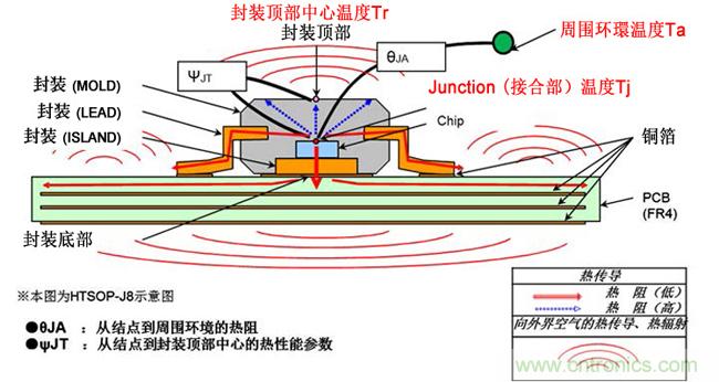 通常,只要知道PCB板貼裝時(shí)IC的熱阻θJA和功耗,或封裝頂部中心溫度TT熱性能參數(shù)ΨJT,即可知道IC大致的結(jié)點(diǎn)(接合部)溫度Tj。如何將該結(jié)點(diǎn)溫度Tj控制在絕對(duì)最大額定值以下是熱設(shè)計(jì)的根本。