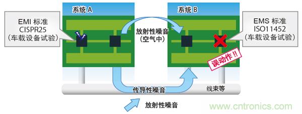 因此,對(duì)車載用產(chǎn)品來說,不妨礙其他設(shè)備(發(fā)射干擾)、以及受到其他設(shè)備妨礙時(shí)能保持本來的性能(抗干擾)是非常重要的。
