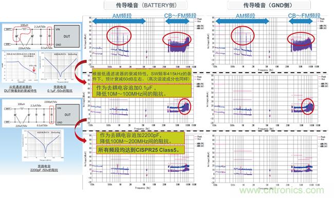 在圖6的示例中,對(duì)于AM頻段噪音,使用Π型濾波器使之衰減;對(duì)于CB~FM頻段噪音,選用諧振頻率在20MHz左右的旁路電容使之衰減,以滿足CISPR25-Class5要求。