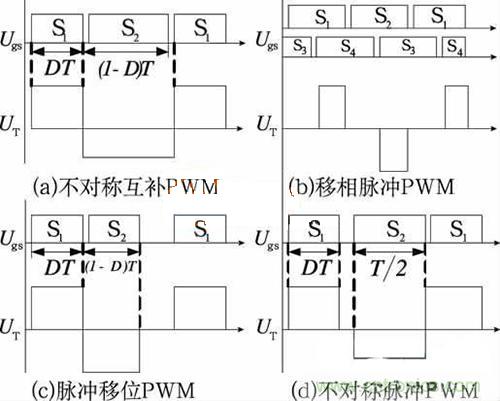 下面我們來具體說一下控制型軟開關(guān)PWM控制策略,它是指控制型軟開關(guān)半橋DC/DC變換器不增加主電路元器件(可增加電感電容元件以實(shí)現(xiàn)軟開關(guān)條件),通過合理設(shè)計(jì)控制電路來實(shí)現(xiàn)軟開關(guān)。圖2給出4種控制型軟開關(guān)半橋DC/DC變換器的PWM控制策略。