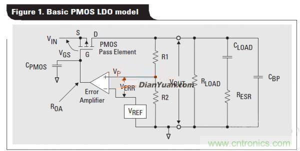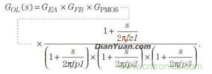 線性電源的等效模型模型如圖1所示, 穩(wěn)定直接如圖可知,電路的三個極點和一個零點,即得到開環(huán)傳遞函數(shù)Gop,GEA是誤差放大器的增益,GFB是反饋環(huán)路的增益,GPMOG是PMOS的增益。