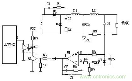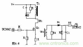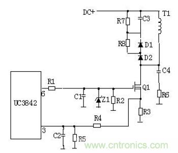 R4、C3、R5、R6、C4、D1、D2組成緩沖器,和開關(guān)MOS管并接,使開關(guān)管電壓應(yīng)力減少,EMI減少,不發(fā)生二次擊穿。在開關(guān)管Q1關(guān)斷時,變壓器的原邊線圈易產(chǎn)生尖峰電壓和尖峰電流,這些元件組合一起,能很好地吸收尖峰電壓和電流。從R3測得的電流峰值信號參與當(dāng)前工作周波的占空比控制,因此是當(dāng)前工作周波的電流限制。當(dāng)R5上的電壓達(dá)到1V時,UC3842停止工作,開關(guān)管Q1立即關(guān)斷。