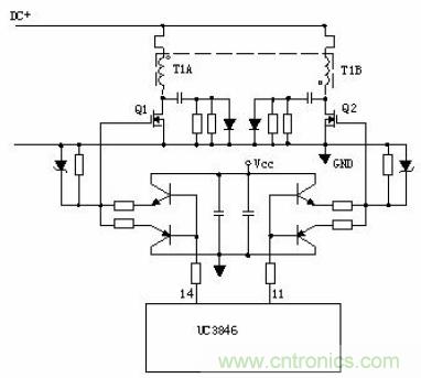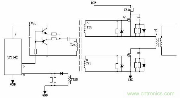 5、有驅(qū)動變壓器的功率變換電路:T2為驅(qū)動變壓器,T1為開關(guān)變壓器,TR1為電流環(huán)。