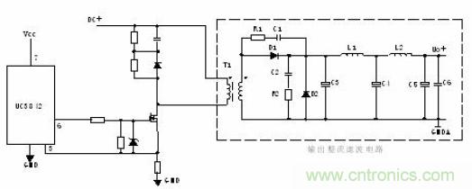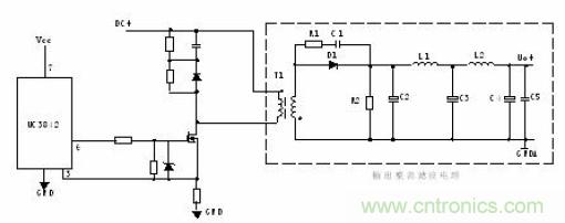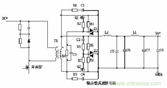 T1為開關(guān)變壓器,其初極和次極的相位同相。D1為整流二極管,D2為續(xù)流二極管,R1、C1、R2、C2為削尖峰電路。L1為續(xù)流電感,C4、L2、C5組成π型濾波器。